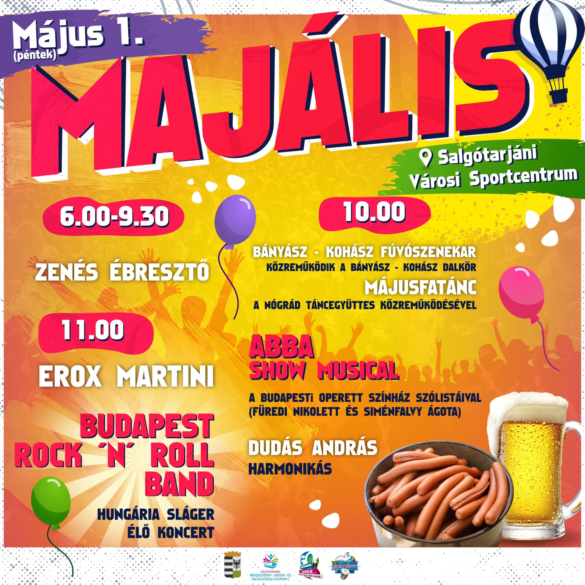 A zenés ébresztőt szolgáltató fúvószenekar végül délelőtt 10 órakor érkezik meg a majális helyszínére, a Városi Sportcentrumba, ahol a Bányász-Kohász Dalkörrel közösen nyitják meg az eseményt. Ezt követően a Nógrád Táncegyüttes tagjainak közreműködésével májusfa táncra hívnak mindenkit. A zenés programok délelőtt 11 órakor kezdődnek, fellép Erox Martini, a Hungária slágerekkel érkező Budapest Rock ‘n Roll Band, Dudás András harmonikás, valamint a Városi Sportcentrumba látogat az Abba Show is a Budapesti Operettszínház szólistáival.